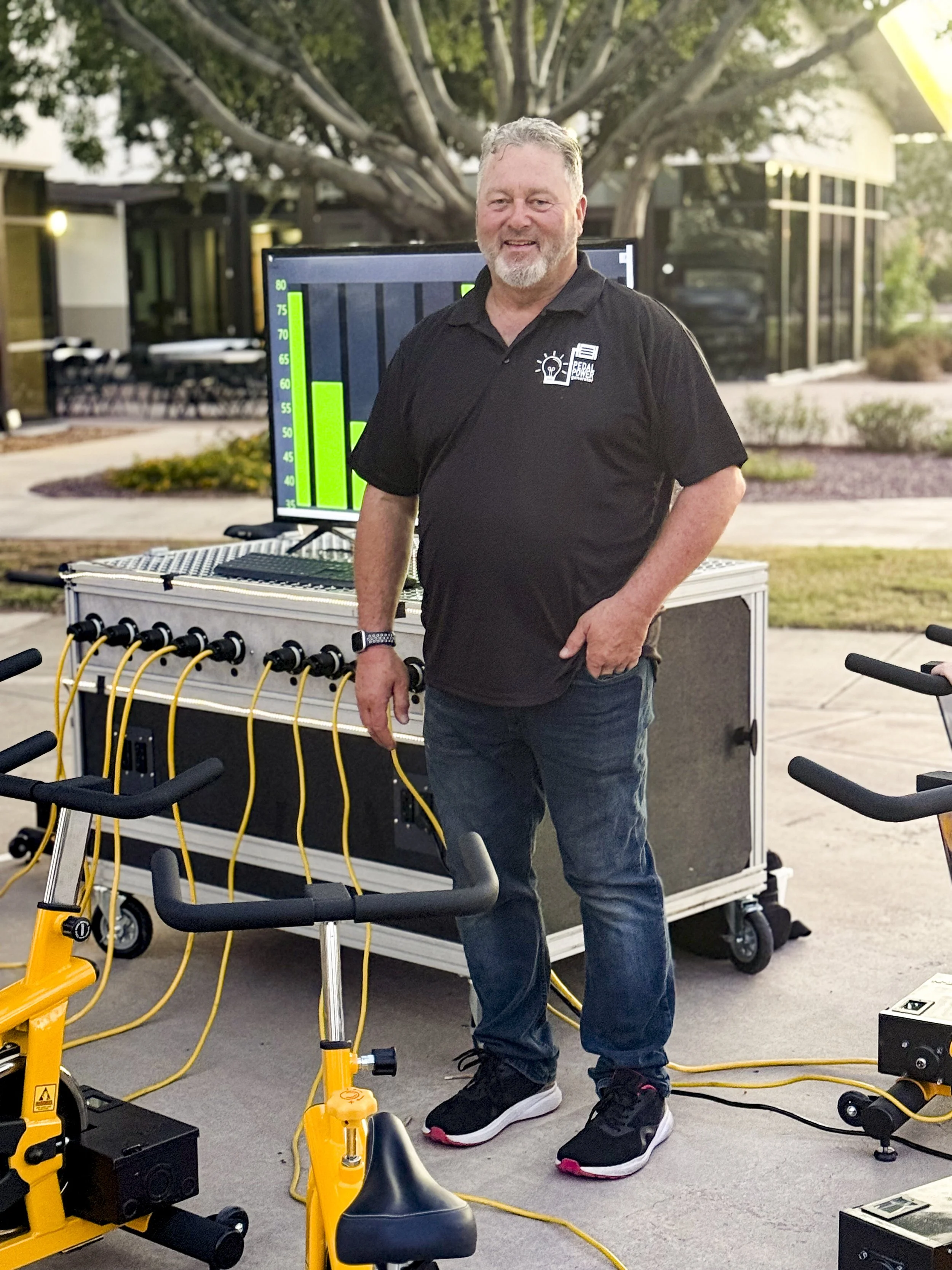 The Human Power Station can be used to power anything you can think of! Concerts, lighting, sound systems, griddles, popcorn machines, blenders, movie projectors, misting systems, and so much more. You can connect up to 20 bikes/hand cranks/solar panels at a time, and connect up to 10 POWER STATIONS TOGETHER which is equivalent to 10,000 watts of continuous power, or 40,000 watts of on demand power. Soon we will be powering a whole concert, just like Coldplay does!!!!
