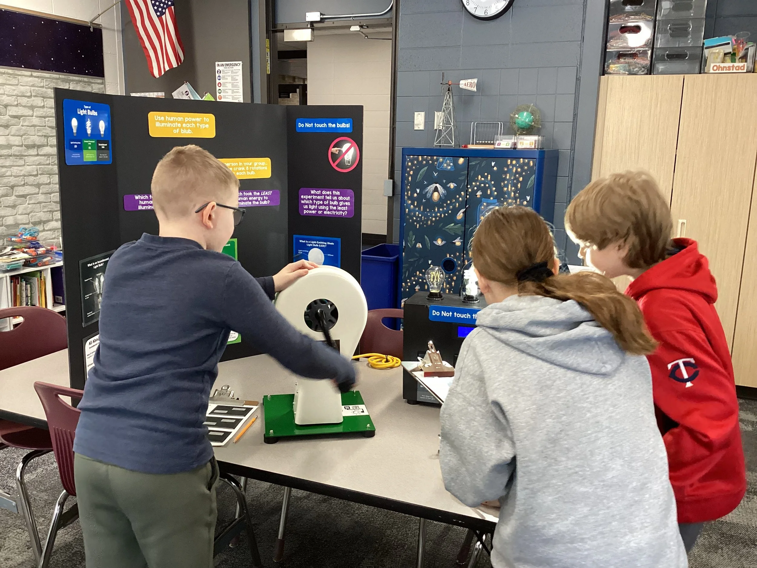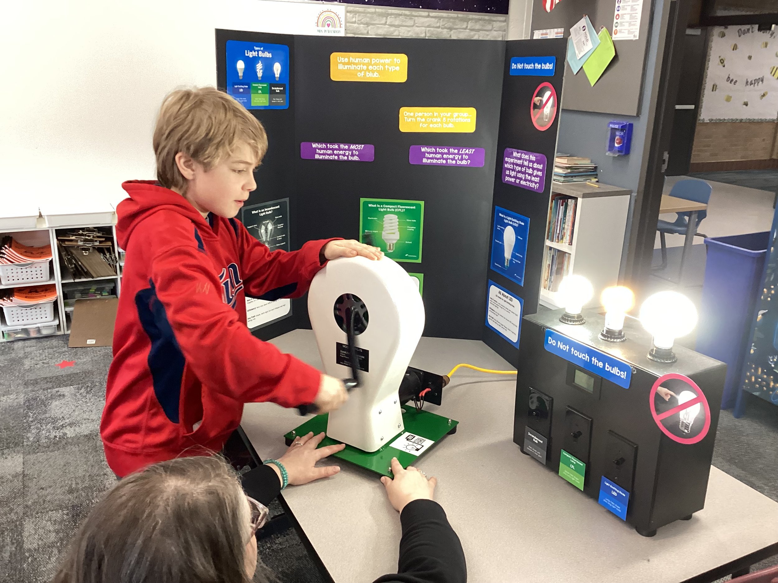 5th graders in an elementary school in Lakeville, Minesota are having fun learning about Watts, Volts, and Amps. They get to physically feel how the Human Power Generator gets harder to turn as they switch to the incandescent bulb. The easiest bulb being the LED, and the 2nd being the CFL. You can put any bulbs you like in the display, the most challenging being 3 incandescent bulbs!
