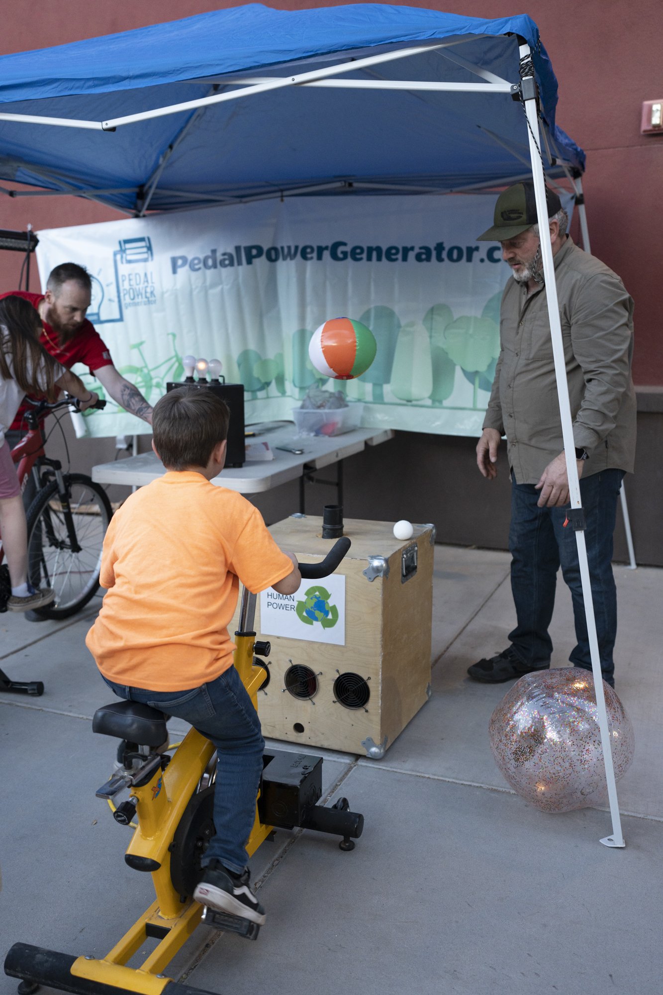 We set up a booth at a family night fundraiser at an elementary school in Queen Creek, AZ. we had our our Exercise Bike Generator powering a floating ball display, and our Bigfoot Bike Generator powering the EcoGlow light display. There was constantly a line, so we’d say that the kids had fun!